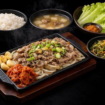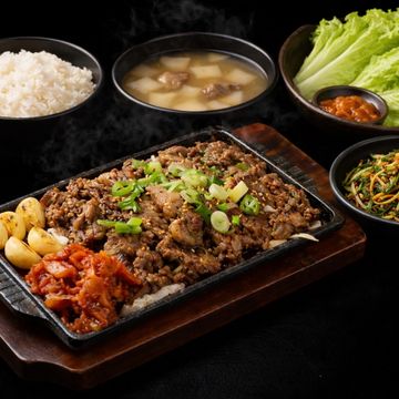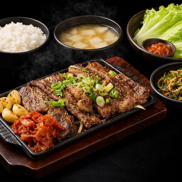 Korean BBQ Meal - Served with rice, house soup, lettuce wrap, green onion salad, garlic & stir-fried kimchi