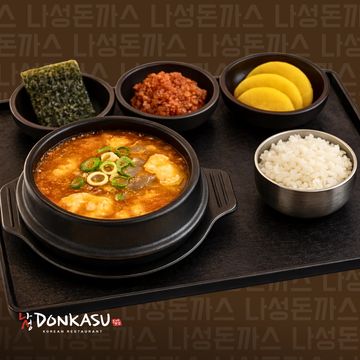 Spicy Tofu Soup with beef, onions, and enoki mushroom. Served with side of Rice, stir-fried Kimchi, pickled Radish, and Crispy Seaweed.