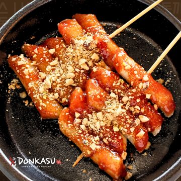 Rice Cake Skewer 2 pc - Sweet & Spicy Gochujang sauce and crushed nuts