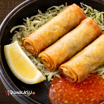 Deep fried 5 pcs Pork and Vegetable dumplings, served with lemon wedge and Spicy Mayo